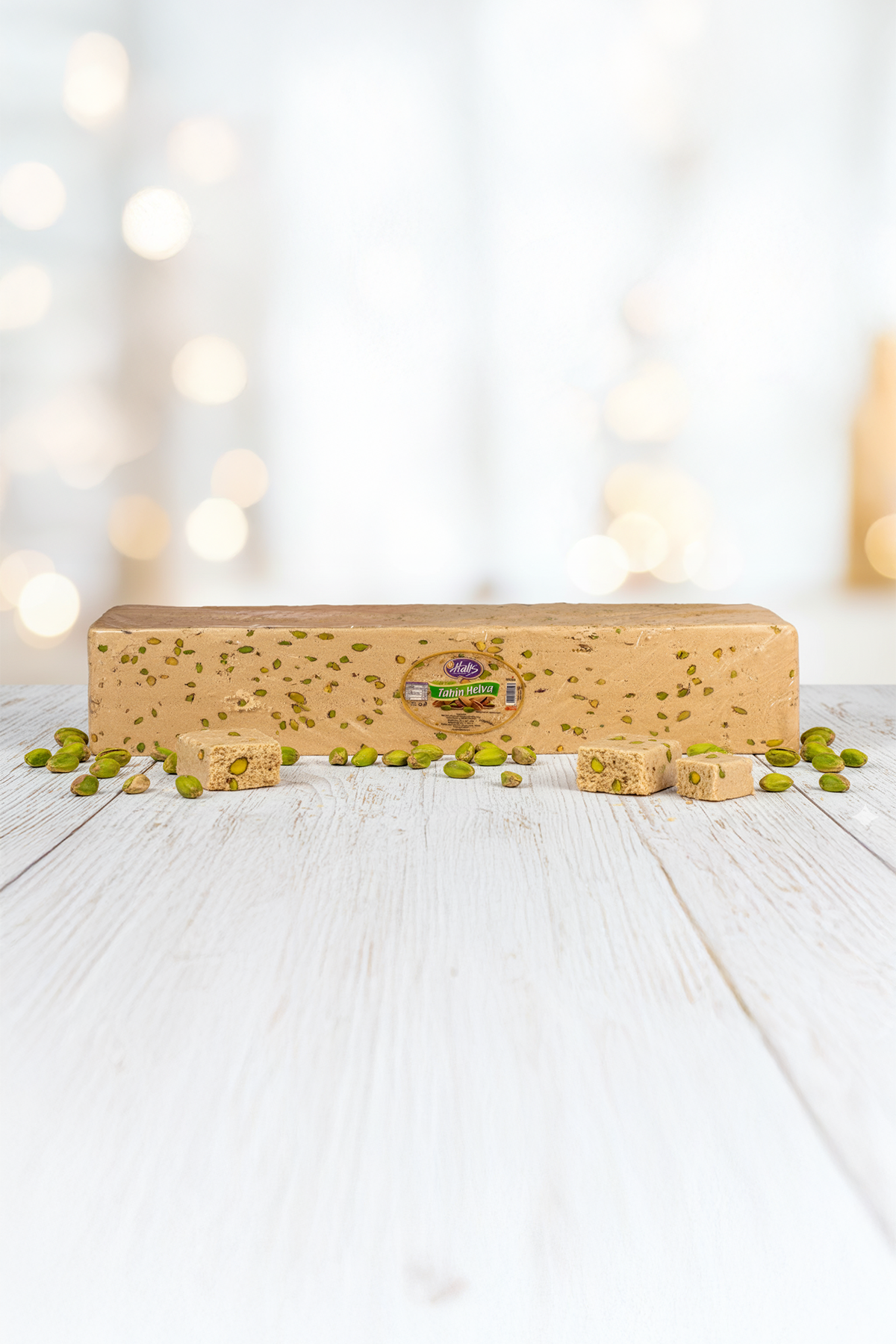 Yoğun Antep fıstığı taneleriyle zenginleştirilmiş klasik Halis Helva formu.